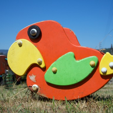Mi excursión dominguera me llevó a un parque infantil solitario y desgastado con estos llamativos balancines de muelle con forma de loro. Dentro de poco Nicolás pugnará por una plaza de balancín o tobogán en cualquiera de los parques de la zona. Es duro. Lo he visto.