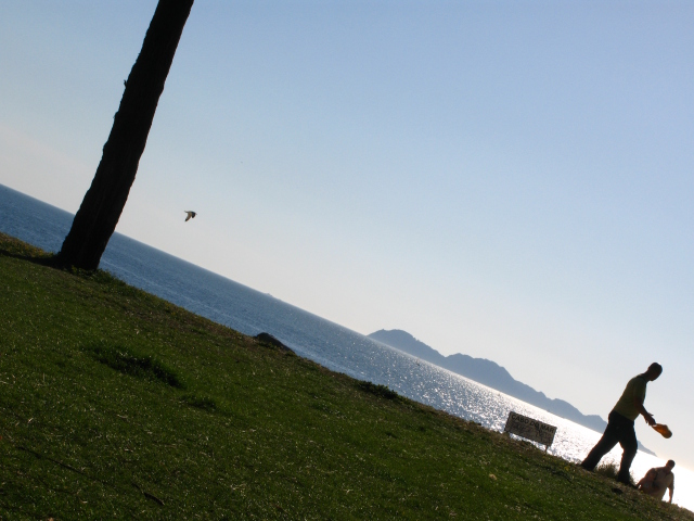 Nada como sentarse en la hierba y observar a la gente que pasa. Hay de todo: niños, parejas, grupos de jóvenes, mamás y papás recién estrenados con sus carritos, jubilautas jugando a las cartas… El tiempo del observador se ralentiza, es como ver las cosas a cámara lenta. Las combinaciones son infinitas. Esta vez lo pude observar desde o Cabo do Mar: