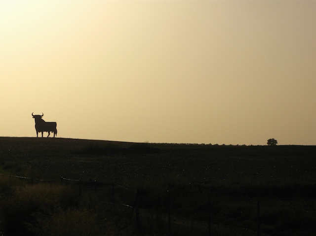 Hay una estampa que se repite en muchos de mis viajes por España, pero especialmente por las carreteras del Sur. Hace tiempo que ando tras de esta foto, cual trofeo de caza mayor, y siempre corriendo, siempre corriendo el legendario toro se me escapaba.