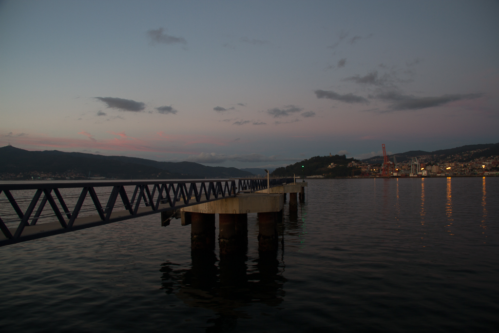 La foto del ejemplo -Ampliación de la terminal de trasatlánticos del Puerto de Vigo- fue tomada cuando ya había poca luz, con una apertura lenta (1/10 segundos) para poder mantener un ISO bajo (100). Pero después fue preciso hacer retoques en el postproceso: