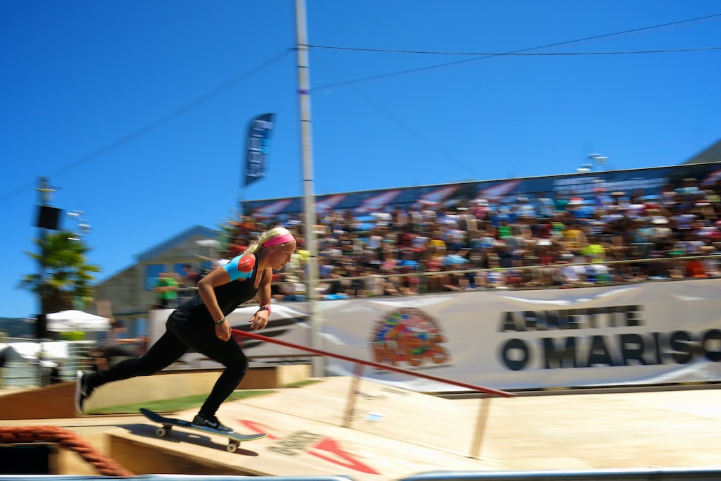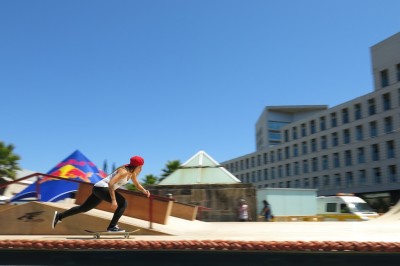 Siento debilidad por la técnica fotográfica del barrido, así que jugué con tiempos de exposición de 1/50 y 1/80, apoyándome a continuación en ISO 100, F8 y el filtro ND incorporado por software en la cámara para centrar el interés en el movimiento de los skaters y aislar la acción del fondo.