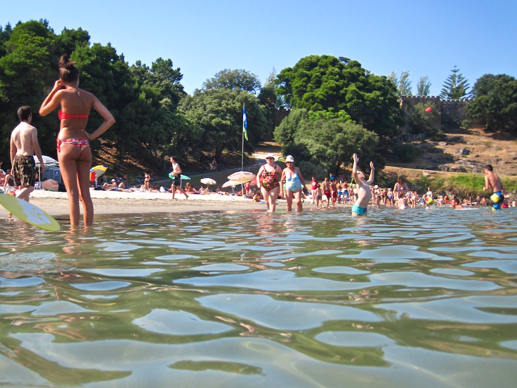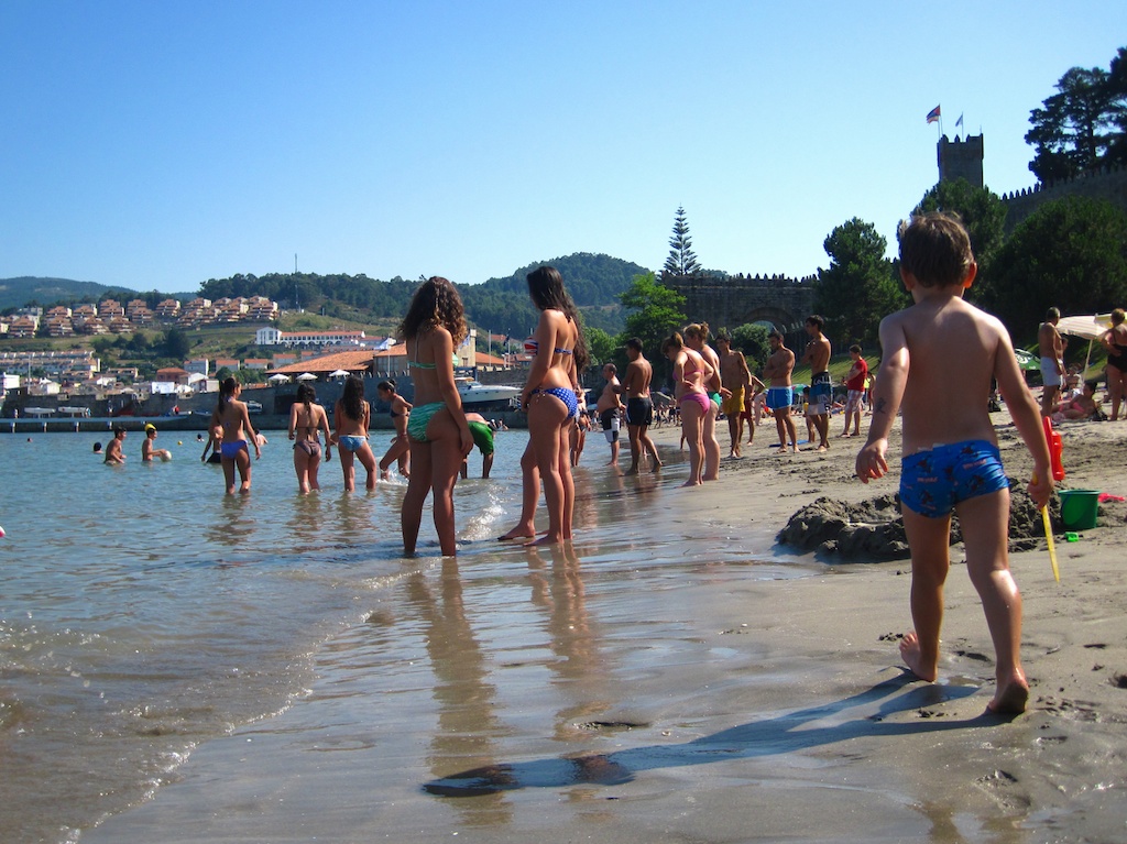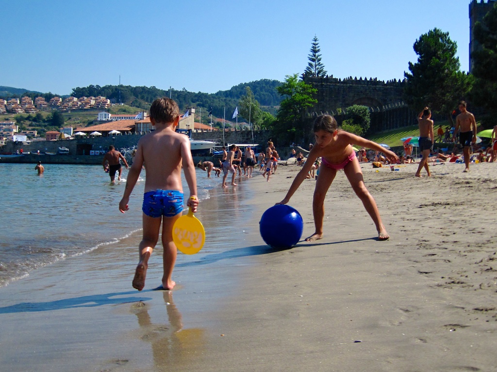 El peque y yo paseamos por la playa jujnto al Parador de Baiona. Yo un poco rezagado y con la cámara de agua en la mano, tomé algunas fotos con la cámara a la altura de la cintura.