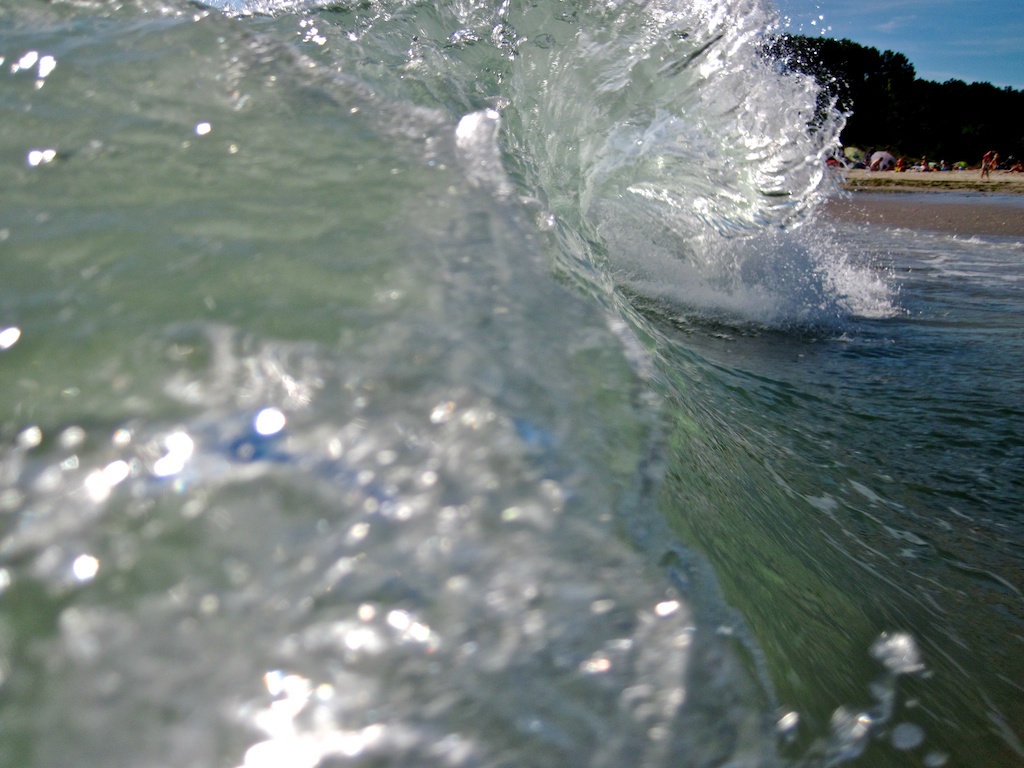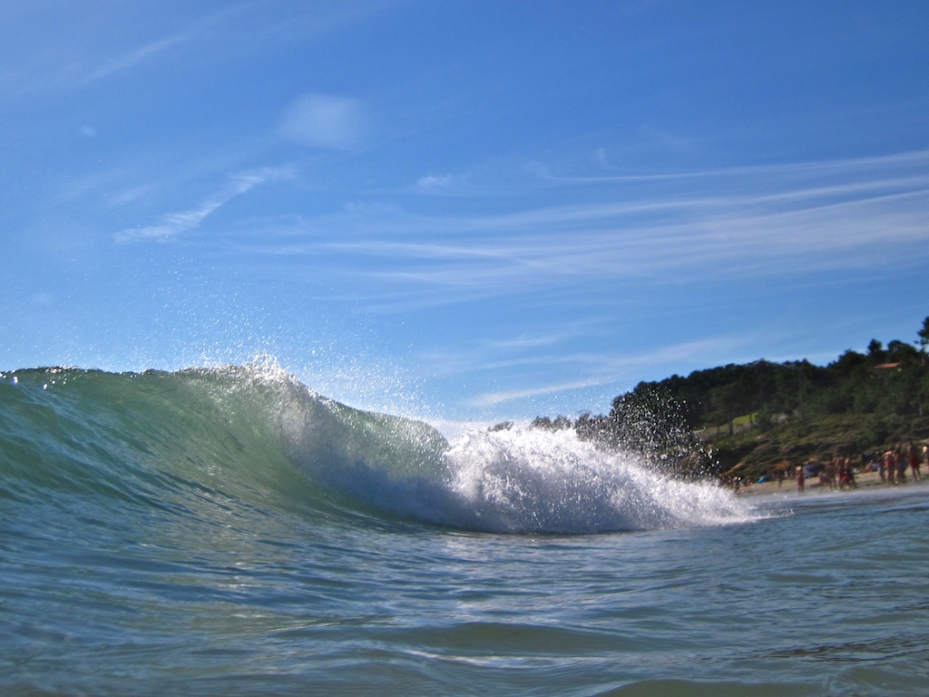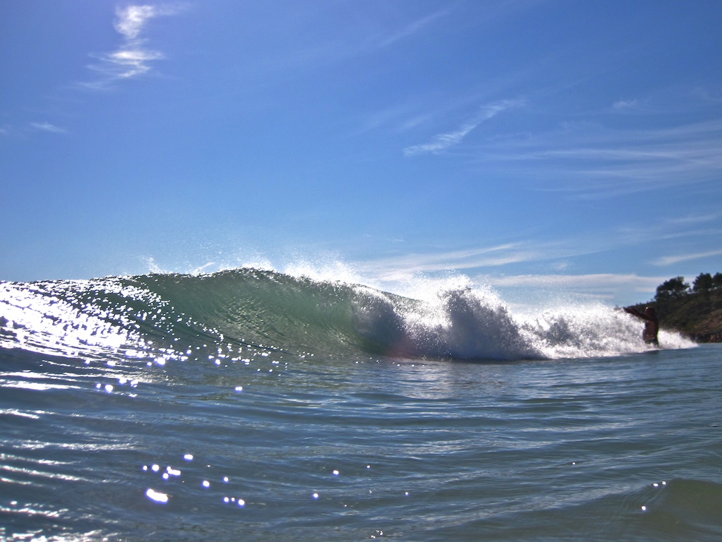 Técnica: Una cámara compacta de agua es perfecta para divertirte sacando fotos durante el baño. Para obtener estas fotos estuve una media hora en el agua, había muy pocas olas, configuré en enfoque al infinito, balance de blancos en Sol, modo ráfaga (1 foto por segundo) y disparé al tanteo unas 200 fotos. El 99% se descartan pero solo hace falta obtener una o dos chulas para irse satisfecho a casa.