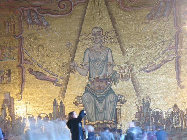 …había poca luz en el gran salón del ayuntamiento de Estocolmo; el mural estaba lejos a unos 20 metros; sabía que esa era la foto que nunca me salía tomándola a pulso y con flash; pero mantuve la sangre fría: modo Manual, minitrípode, ISO 200, f8, 2.5 seg.