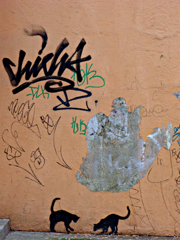 Cuando vi este grafiti por primera vez desde unos 25 metros, creí de verdad que dos gatos callejeros se enfrentaban o jugaban junto a una escalinata al fondo de la calle. Luego, lo estático de la escena fue aumentando mi sospecha de que aquello no era real.