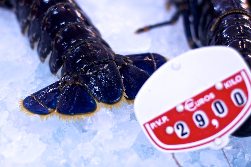 La foto de esta cola de langosta azul la tomé en el mercado de O Grove.