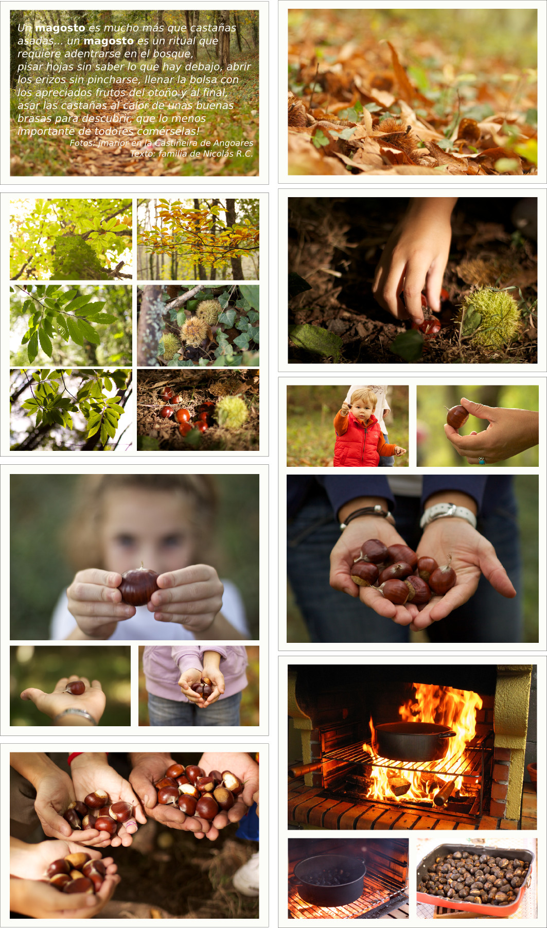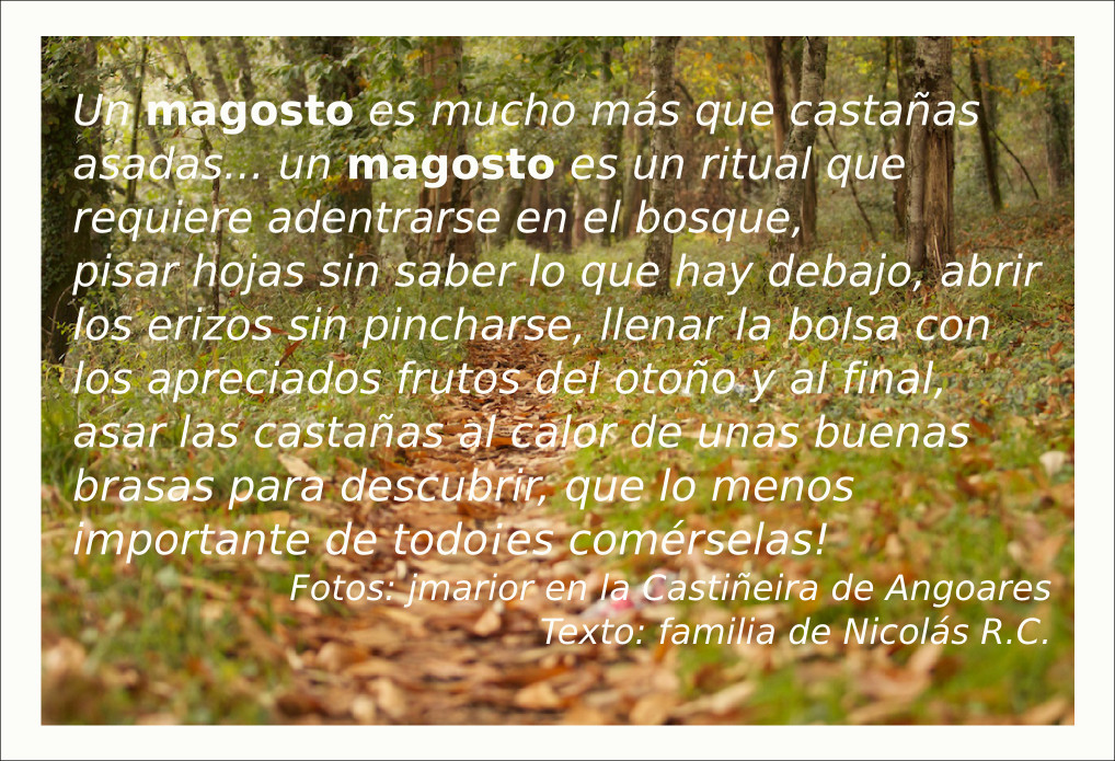 Un magosto es mucho más que castañas asadas… un magosto es un ritual que requiere adentrarse en el bosque, pisar hojas sin saber lo que hay debajo, abrir erizos sin pincharse, llenar la bolsa con los apreciados frutos del otoño y al final, asar las castañas al calor de unas buenas brasas para descubrir, que lo menos importante de todo¡es comérselas!