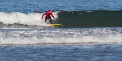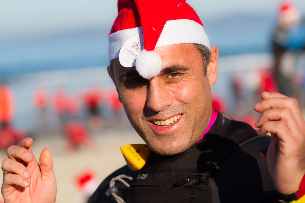 Fue un día estupendo: 13ºC en el agua y 18ºC fuera. No hacía frío ni para los bañistas ni para los espectadores. Marea baja, nada de viento, olas pequeñas y algunas suaves. De 100 a 200 personas en el agua con sus tradicionales gorros rojos de Papá Noel.