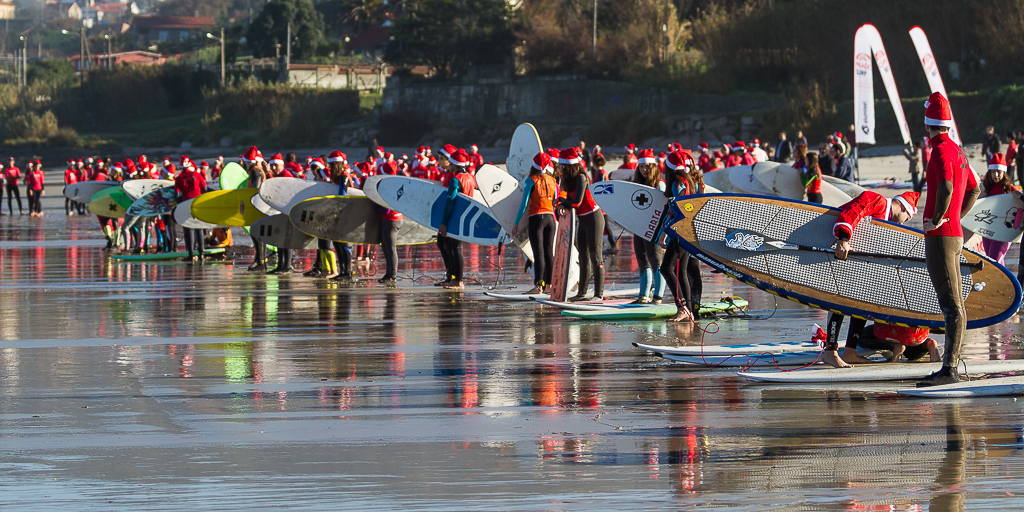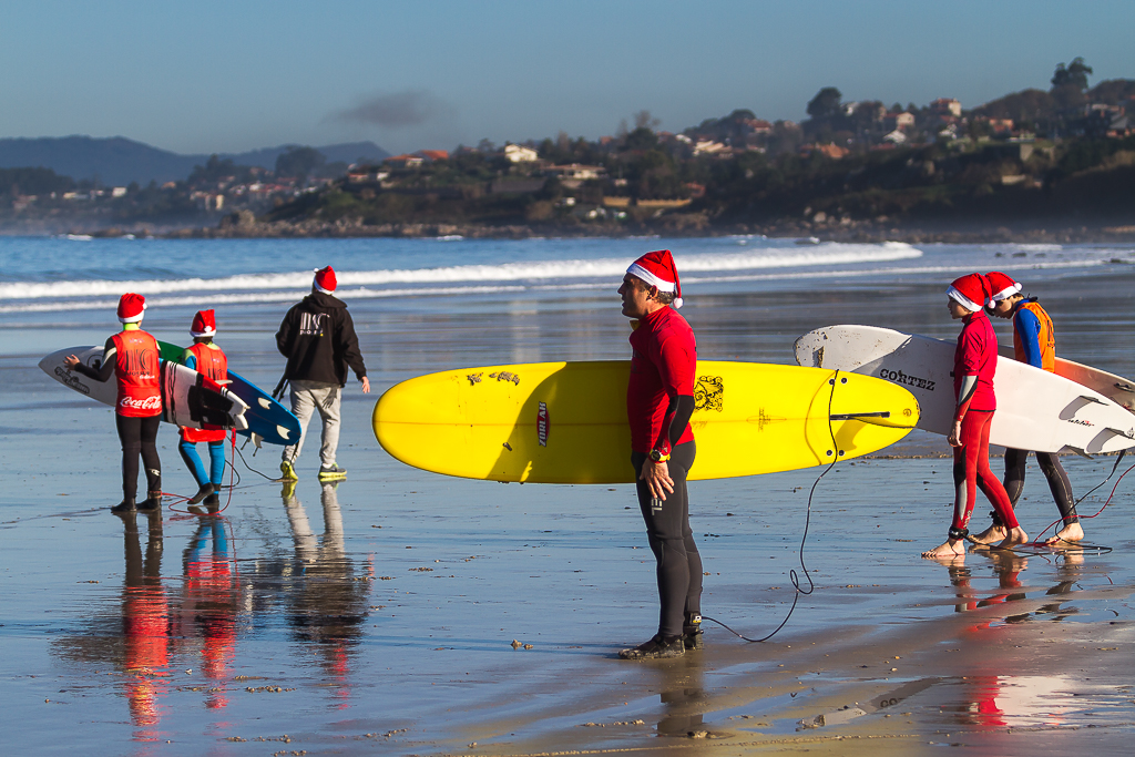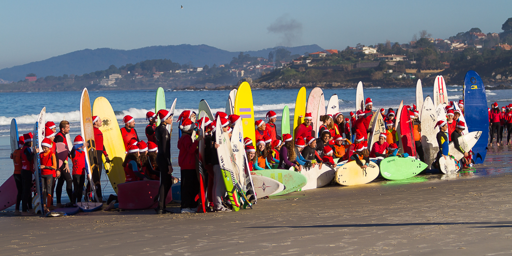 Hoy no tocan consejos fotográficos, hoy toca felicitar la Navidad… y para ello un buen motivo fotográfico son los Papá Noeles Surferos de la playa de Patos. Un bonito evento celebrado este domingo (21 de diciembre) en el que los surfistas iban vestidos o tocados de Papá Noel.