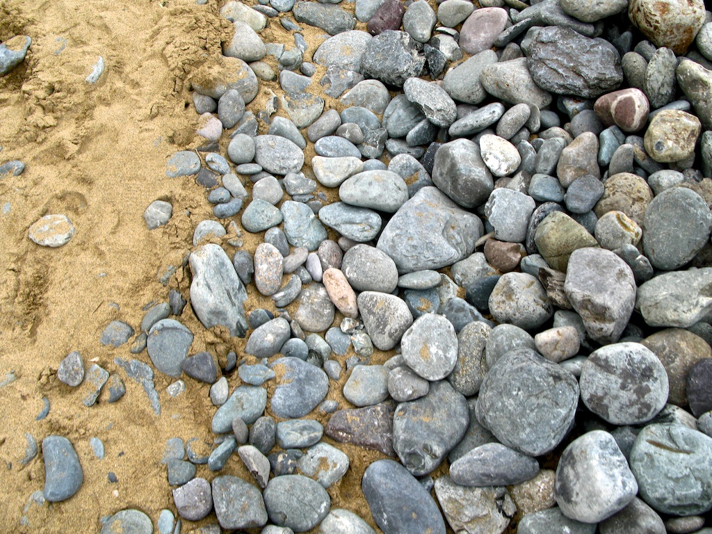 La verdad que yo de playas no soy, pero esta combinación de piedras y arena, es genial. Me encanta como se resaltan la difrencia del color marrón y gris en esta foto. La perfección con que se ven los granitos de arena, pero parece que fuera un día gris.