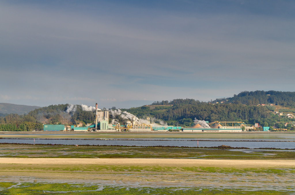 La contaminación más grave de la ría se debe a ELNOSA -una pequeña planta que produce cloro, detrás de los árboles que aparecen en el extremo izquierdo de la foto- y que vertió durante años mercurio. Antes el papel se blanqueaba con cloro, ahora esto se hace con ozono. En el proceso de hidrólisis para la obtención del cloro se utilizan electrodos de mercurio, de ahí los vertidos.