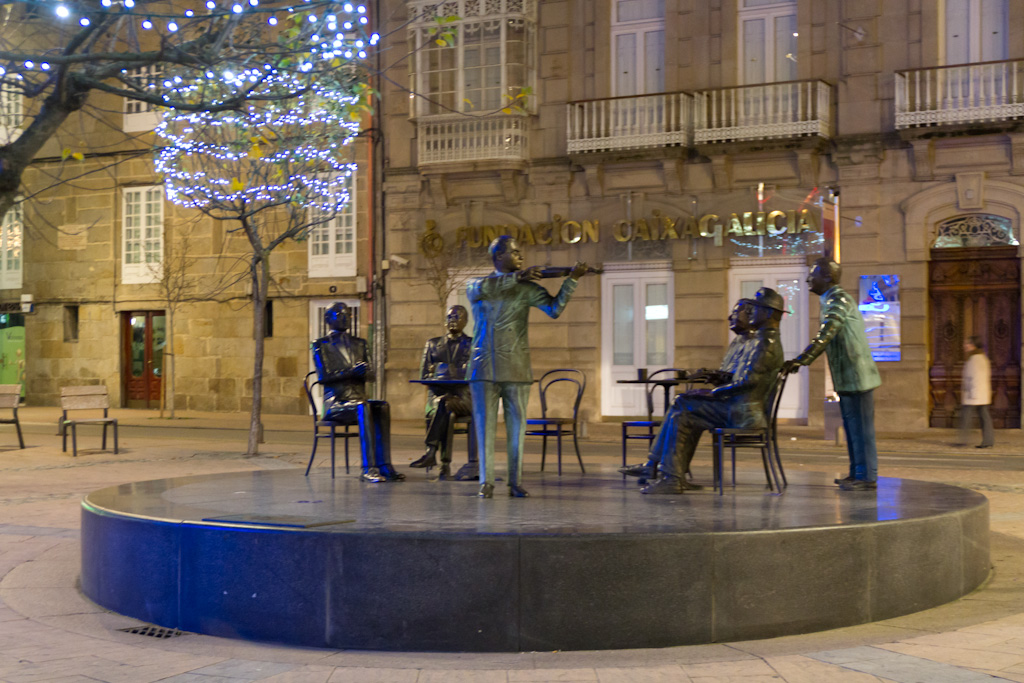 Esta primera foto está tomada en la Plaza de San José, el conjunto representa las tertulias que se celebraban en el café Moderno, que está al fondo (ahora pertenece a la Fundación Caixa Galicia) y en las que participaban Castelao, Manuel Quiroga, Ramón Cabanillas, Bóveda, etc.