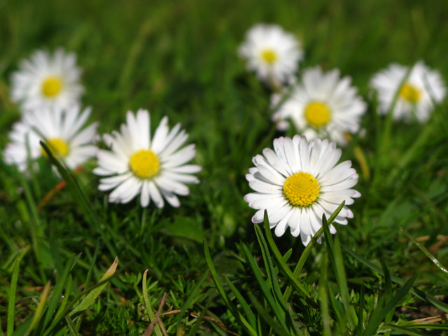Hay cientos de pequeñas margaritas silvestres por todos lados. Ten cuidado, no las pises. Son la esencia de la primavera.