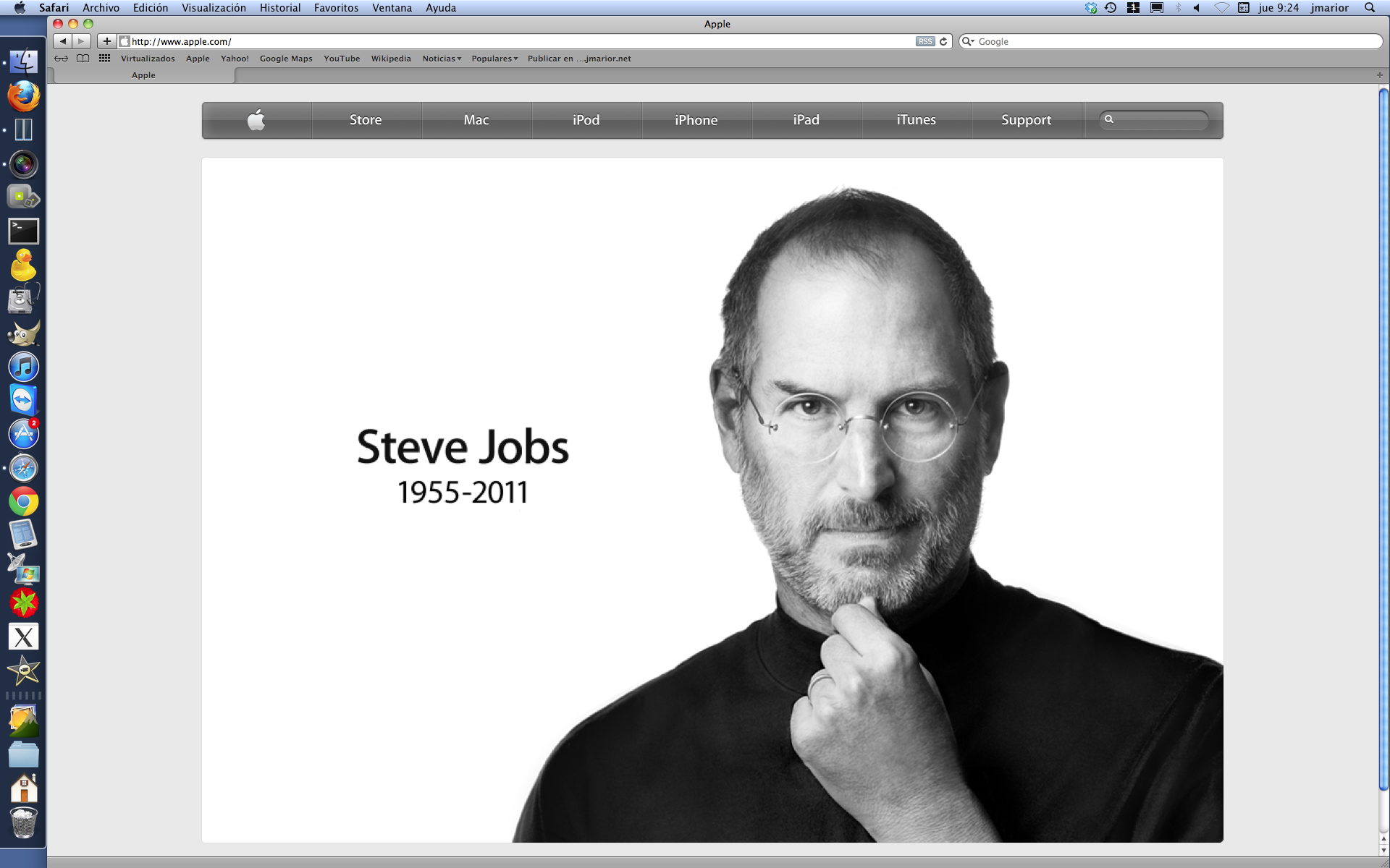 T4 · 24 proyectos fotográficos · Temporada IV Steve Jobs 1955-2011 6 octubre, 20116 octubre, 2011 jmarior En honor a Steve Jobs 1955-2011. Pay tribute to Steve Jobs 1955-2011. Similar Posts Coches de choque 24 octubre, 20112 noviembre, 2013 jmarior Circo Richards Bros XII · Sandy y Samantha 1 abril, 201230 noviembre, 2012 jmarior