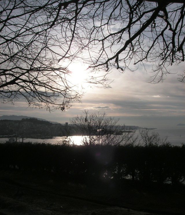 Teniendo en cuenta que soy un crítico de fotografía incipiente te diré lo que se puede mejorar según mi punto de vista -y como dice el Kapi– las ramas y el seto del centro que sobran porque desvían la atención de la panorámica, la mancha o aberración cromática que ensucia el cuadro y la zona inferior que no aporta nada al escenario que nos quieres mostrar (entiendo ue la ciudad al fondo á beira do mar). Quizás reencuadrar un poco hacia arriba mejoraría la vista.