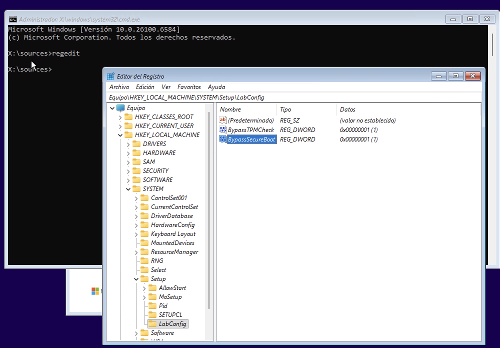 - BypassTPMCheck y establecer el valor a 1